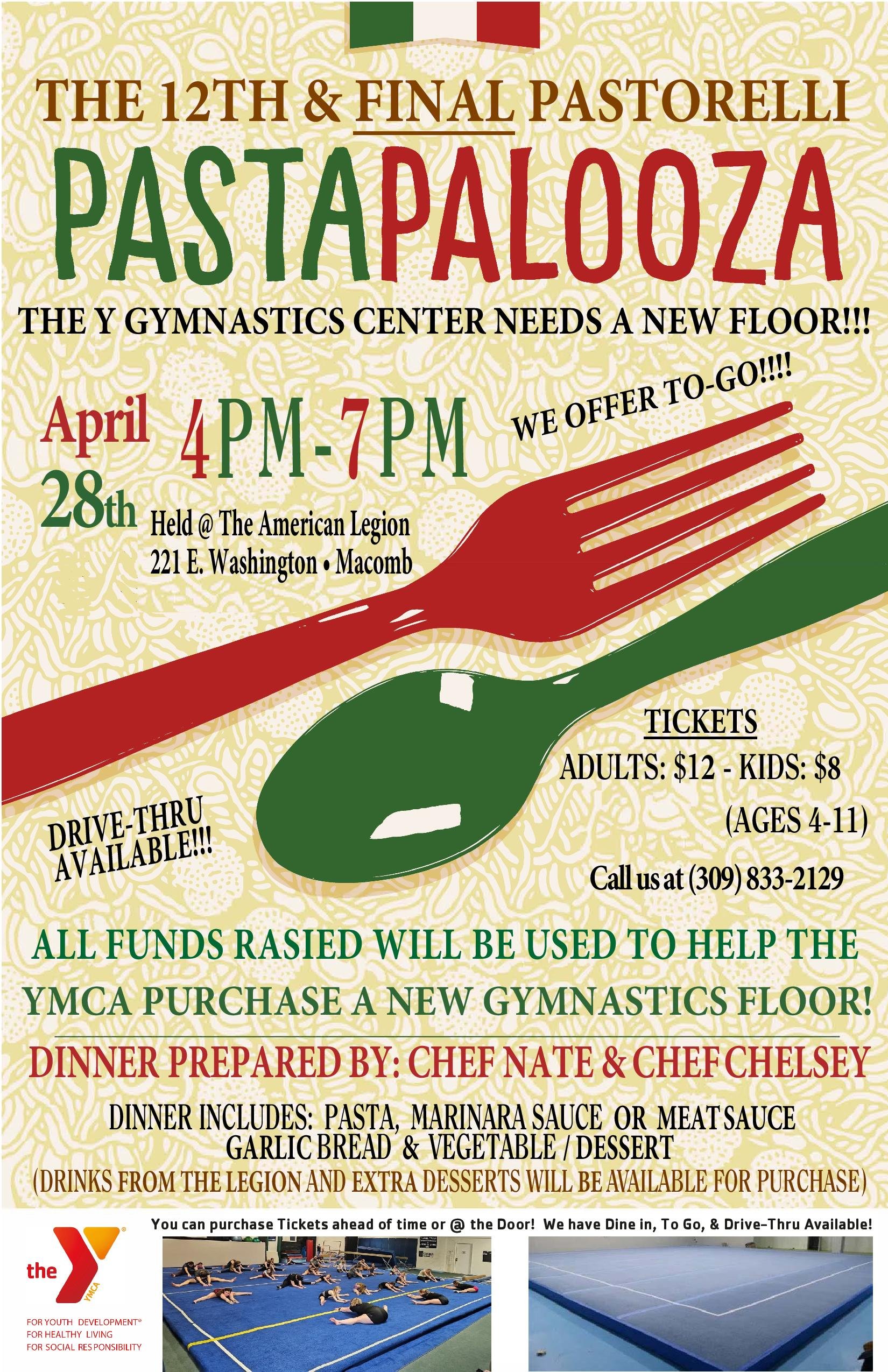 YMCA Fundraiser Pasta Palooza Dinner for the Community, Tickets for sale. All proceeds go toward a New Gymnastics Floor!