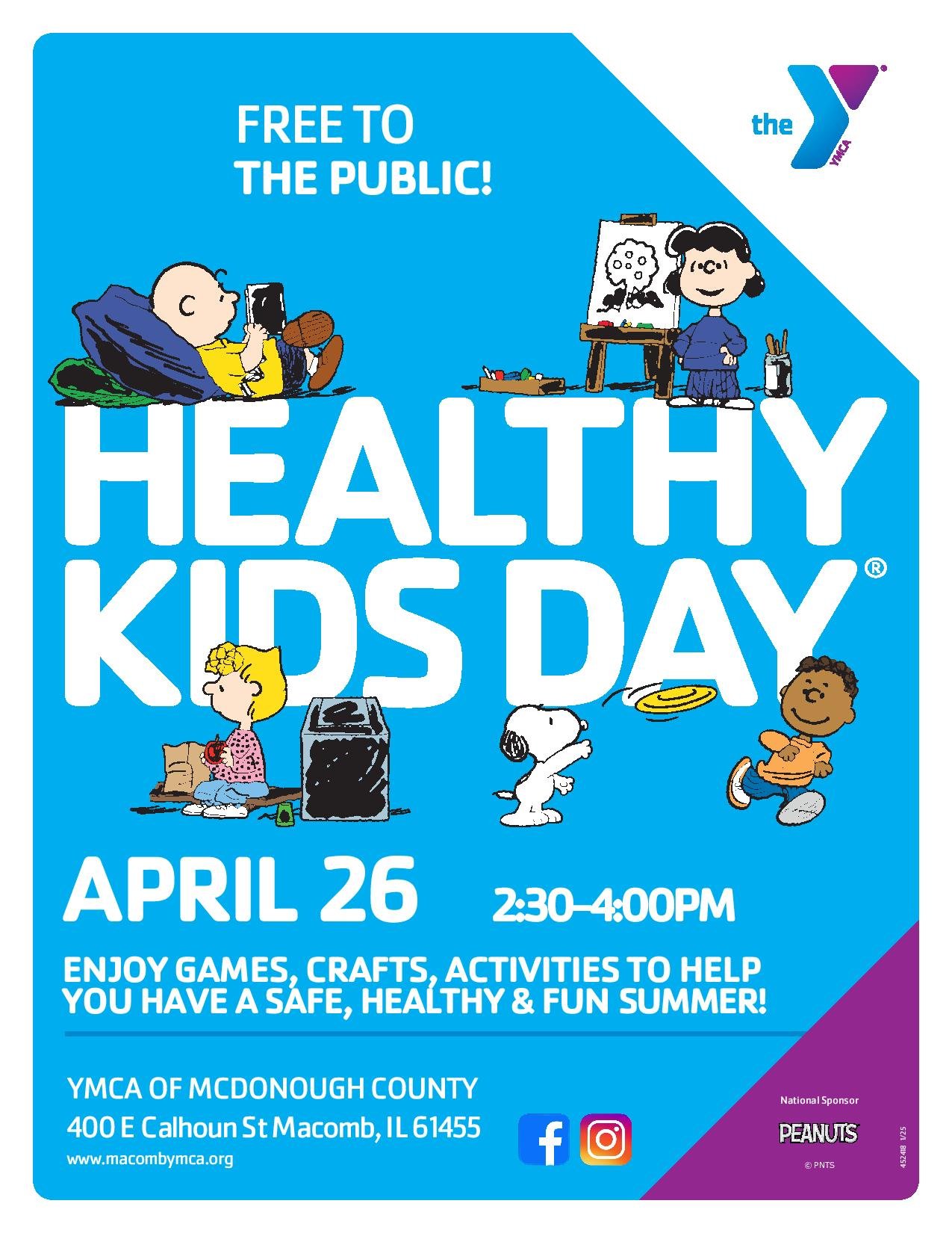 SAT April 26th 2:30-4PM An youth centered event Free to the Public held at the YMCA. Enjoy games, crafts, activities to help you have a safe, healthy & fun Summer!